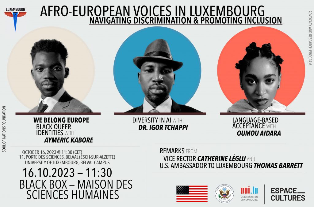 U.S. Embassy Luxembourg, the Soul of Nations Foundation and the University of Luxembourg are pleased to invite members of the press to a presentation of findings from research and advocacy projects on the topic of “Afro-European Voices in Luxembourg: Navigating Discrimination and Promoting Inclusion” on Monday, October 16, 2023, at 11:30 AM at the Black Box – Maison des Sciences Humaines (11, Porte des Sciences, Belval).