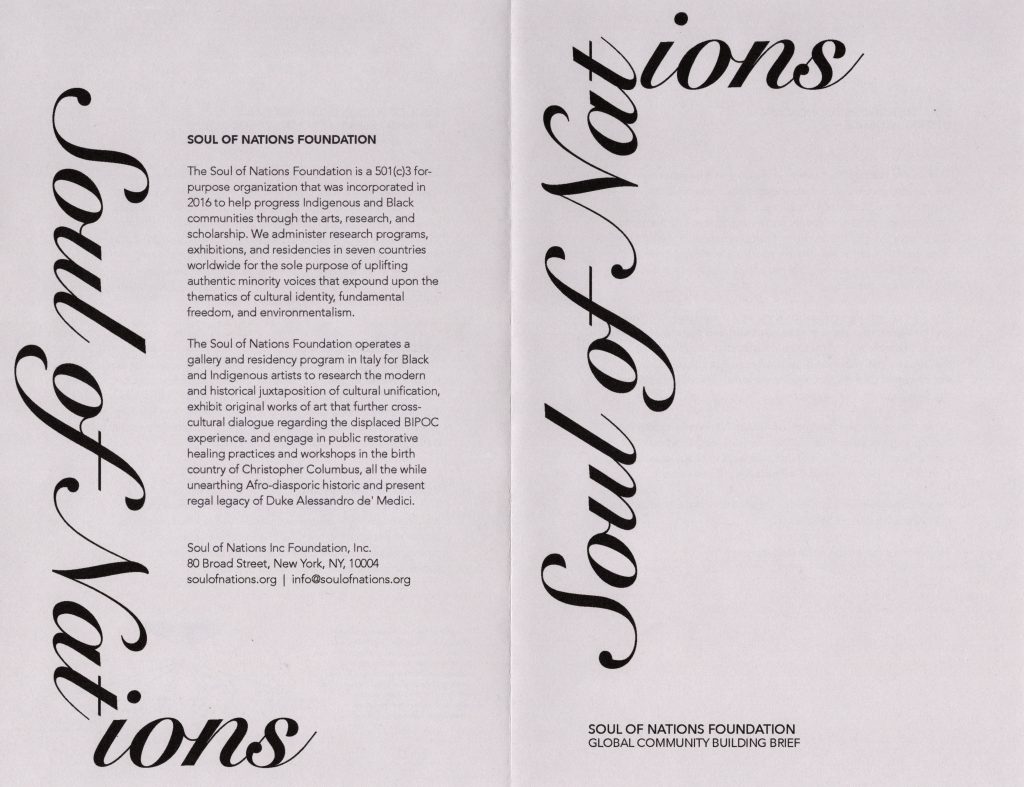 The Soul of Nations Foundation has held art and education programs in new York City since 2016. In 2021, the Soul of Nations Foundation relocated to Lower Manhattan in good faith to invite transitional perspectives for space reclamation, progressive cultural representation, and neo-healing experimentation. Being a newcomer to the cultural nexus that we now call home, the Soul of Nations Foundation is in need of building community and is seeking to meet with allies, partners, and patrons who share similar philanthropic values to help foster critical and altruistic methods for the induction or culturally-present spiritual experimentation through contemporaneous prisms that catalyze the listening and learning process.